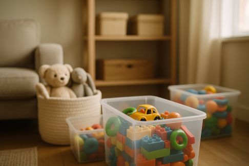 - Étagères murales : libèrent l’espace au sol, accessibles aux enfants.