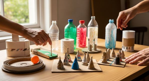 - Création éclair : Donnez 10 minutes à chaque équipe pour fabriquer, avec des matériaux recyclés (papier, rouleaux, carton…), un objet original ou un déguisement à présenter devant le jury familial.