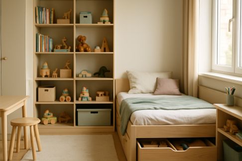 - Coin jeux ou lecture enfants : un tapis délimite la mini-bibliothèque ou la zone de jeu, avec bacs à jouets fermés (ou boîtes coulissantes sous un meuble). Évitez de multiplier les espaces : mieux vaut un coin ordonné, facile à replier en fin de journée.